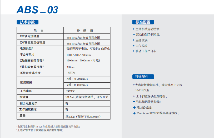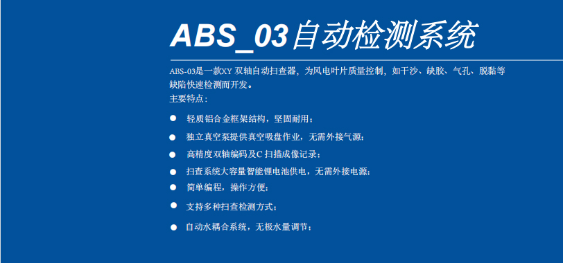 ABS-03 是一款 XY 双轴自动扫查器,为风电叶片质量控制,如干沙、缺胶、