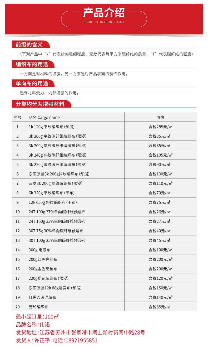 本网页所展示的有关【3k-200g-平纹碳纤维编织布(预浸)-价格电议_其它增强材料_张家港伟诺复合材料有限公司】的信息/图片/参数等由复材云集的会员【张家港伟诺复合材料有限公司】提供,由复材云集会员【张家港伟诺复合材料有限公司】自行对信息/图片/参数等的真实性、准确性和合法性负责,本平台(本网站)仅提供展示服务,请谨慎交易,因交易而产生的法律关系及法律纠纷由您自行协商解决,本平台(本网站)对此不承担任何责任。您在本网页可以浏览【3k-200g-平纹碳纤维编织布(预浸)-价格电议_其它增强材料_张家港伟诺复合材料有限公司】有关的信息/图片/价格等及提供【3k-200g-平纹碳纤维编织布(预浸)-价格电议_其它增强材料_张家港伟诺复合材料有限公司】的商家公司简介、联系方式等信息。